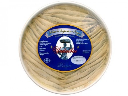 Pandereta de Filetes de Anchoas del Cantábrico en vinagre, cubiertos de aceite, para su mejor conservación.
